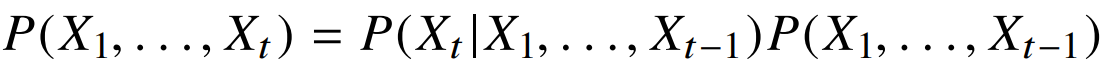 1~t까지의 시퀀스가 있을때, t까지의 전체 시퀀스의 확률분포는 각 스텝에서의 조건부확률의 곱으로 볼수있다. 이는 chain rule을 통해서 정리될 수 있다.