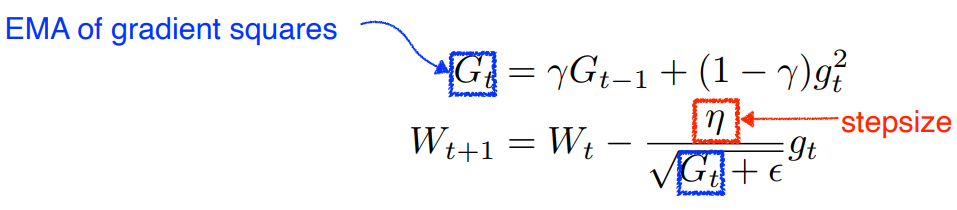 adaptive learning rate는 gradient의 지수이동평균(Exponential Moving Average : EMA)를 계산하여 반영하게 되며, step이 지날수록 최근의 gradient를 더 크게 반영하고 그 전의 gradient를 순차적으로 적게 반영시키는 것이 된다.