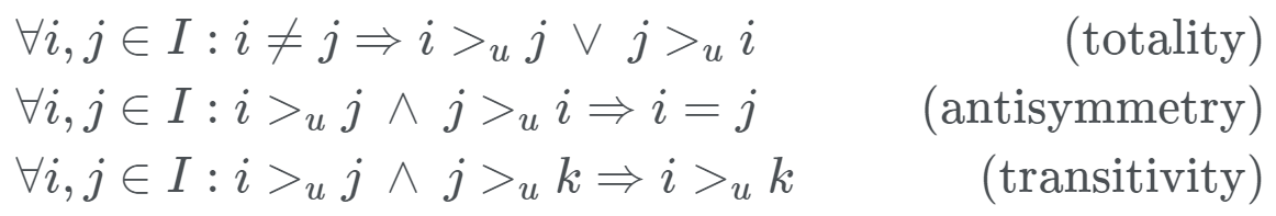 Personalized Total Ranking(>_u)은 해당 user가 선호하는 item의 집단에 대하여 예측된 선호도 순서를 말한다. Personalized Total Ranking는 두 개의 item에 대한 선호도의 상대적 순서를 나타내므로, 개수는 전체 item 집단의 수에서 2개를 선택하는 조합의 수와 같다. 또, 다음과 같은 속성을 만족한다.