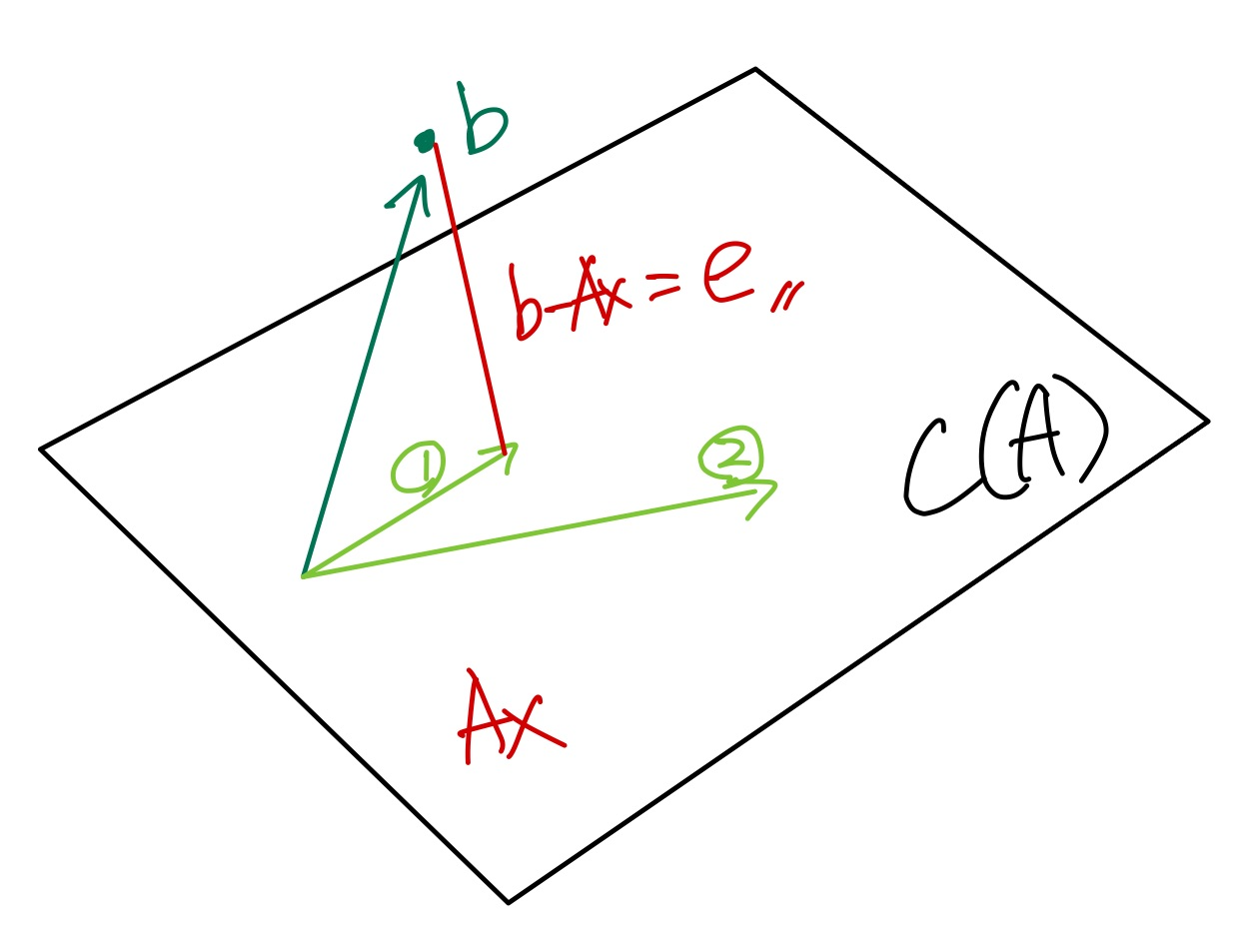 위의 그림과 같이 $A$의 열공간 $C(A)$이 평면으로 표현된다고 하자. 이 공간 안에 $A\textbf{x}$가 있고, 이 공간 밖에 벡터 $b$가 존재한다고 하자.