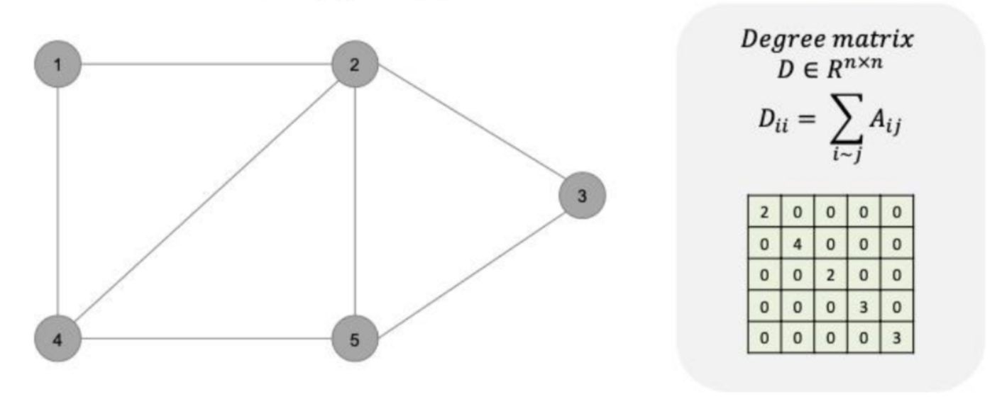 Degree Matrix는 각 노드가 주변 n개의 노드와 연결되어 있는지를 표현한 행렬이다. 위의 오른쪽 행렬과 수식처럼 표현되며, $a_{11}$의 성분은 1 node와 연결된 node의 수가 2(연결된 edge의 수가 2)인 것이다.