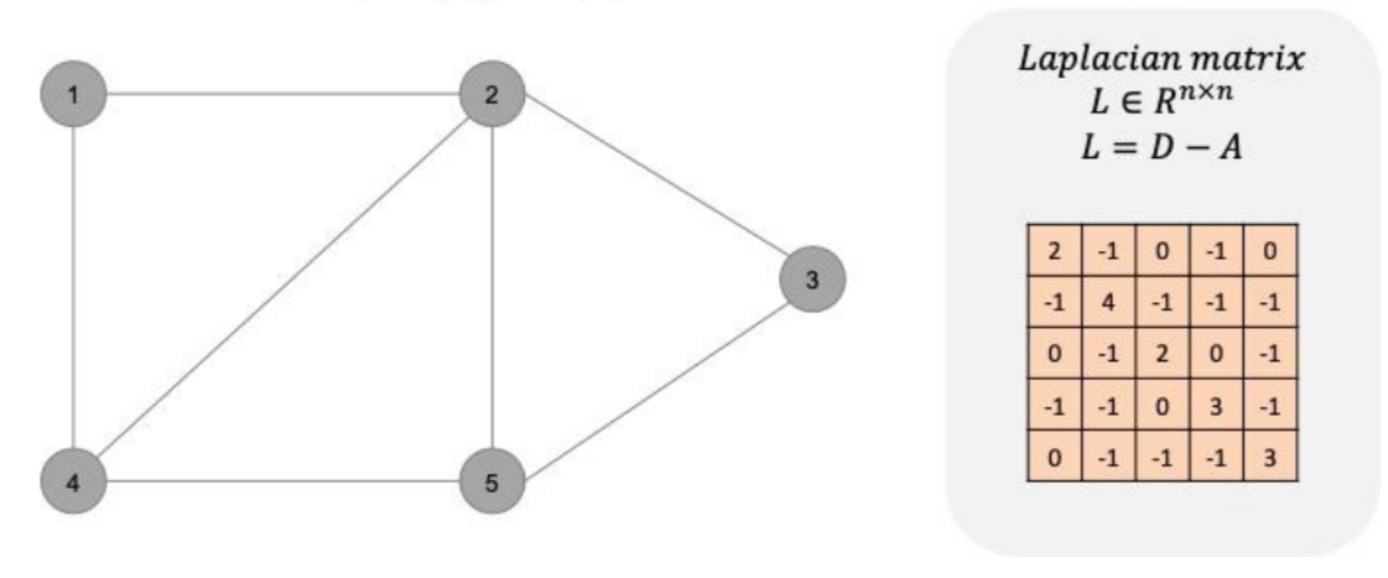 각 node에 연결된 edge 수를 의미하는 차수 행렬에서 인접행렬을 뺀 라플라시안 행렬은 원래의 인접행렬을 변환한 것으로 이해할 수 있다. 이러한 라플라시안 행렬은 그래프의 유용한 특성을 찾고자 할 때 많이 사용한다.