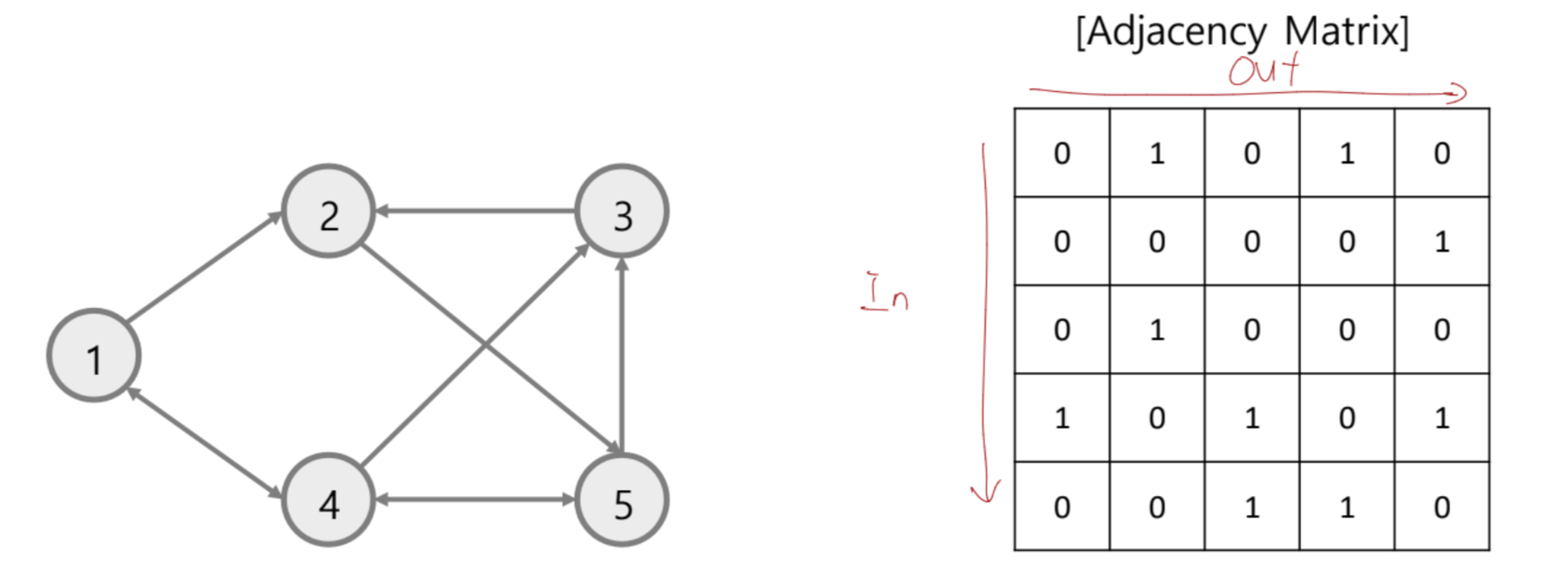 행렬의 행이 입력, 열이 출력으로 보았을때 화살표를 받는 쪽이 1로 표현된다. 예를 들어 1 -> 2 인경우, $a_{12}=1$로 표현된다. 그러므로 그림의 우측의 행렬과 같이 Symmetric하지 않다.