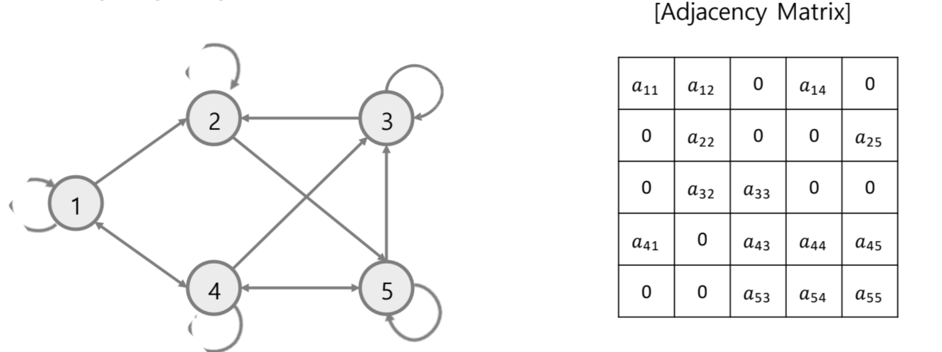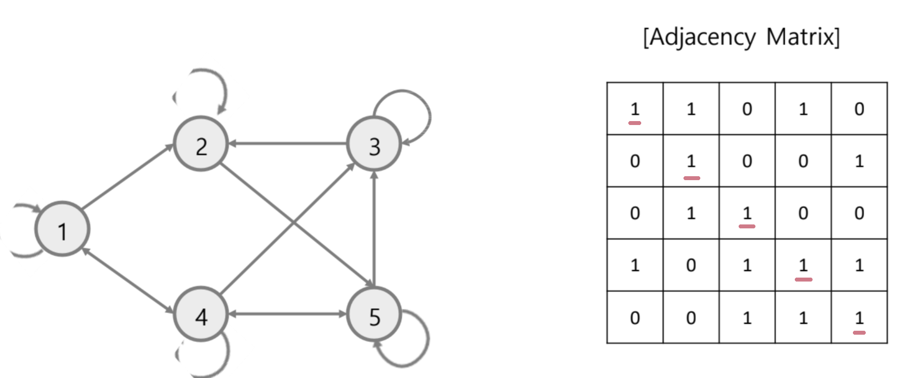 방향성이 있는 인접행렬과 Self-Loop를 더한 형태이다. Self-Loop는 자기자신과의 연결성을 1로 표현하는 것이며, 이는 항등행렬($I$)를 더하는 것과 같으므로, 인접행렬(Adjacency matrix) + 항등행렬(Identity matrix : Self-Loop)로 표현된다.